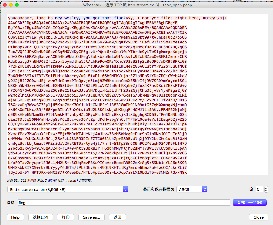 用 wireshark 打开,搜索关键字 flag,很容易找到一串 base64: