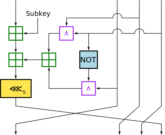 // R[i] = R[i] - K[j] - (R[i-1] & R[i-2]) - ((~R[i-1]) & R[i-3]);