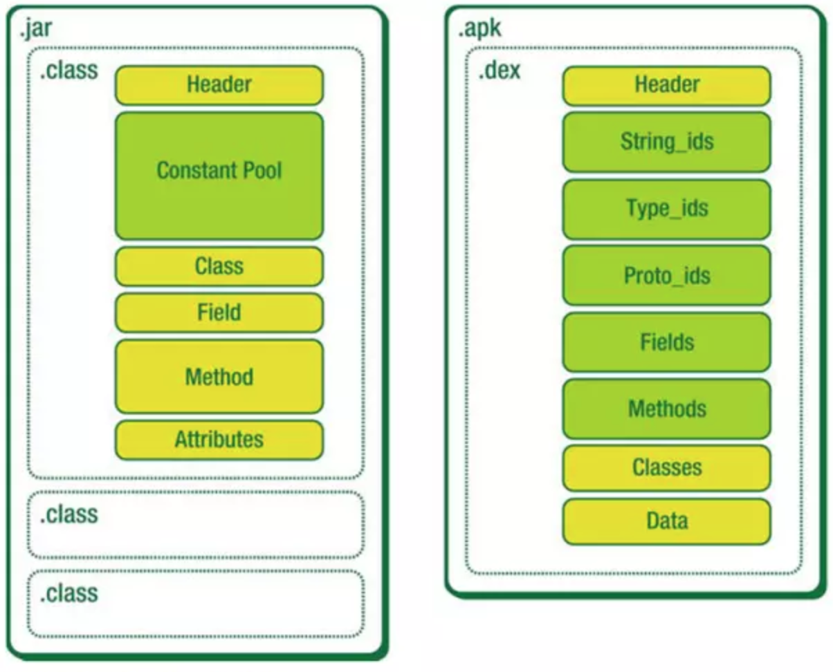 Android 程序编译以后生成 apk 文件,里面的 classes.dex 文件存放着程序运行的字节码,dex 文件是可以直接在 Dalvik 虚拟机中加载运行的文件。由于 Dalvik 是一种针对嵌入式设备而特殊设计的 Java 虚拟机,所以 dex 文件与标准的 class 文件在结构设计上有着本质的区别。当 Java 程序编译成 class 后,还需要使用 dx 工具将所有的 class 文件整合到一个 dex 文件,目的是其中各个类能够共享数据,在一定程度上降低了冗余,同时也是文件结构更加经凑,dex 文件是传统 jar 文件大小的 50% 左右。要想手工脱壳,必须先了解 dex 的文件格式。